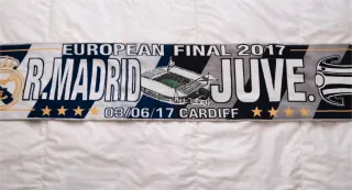Bufanda conmemorativa de la final de la Champions League 2017 entre Real Madrid y Juventus. - Diseño reversible con los escudos y nombres de ambos equipos. - Incluye la fecha y lugar de la final: Cardiff, 03/06/17. - Detalle de estrellas doradas y camisetas de los equipos.