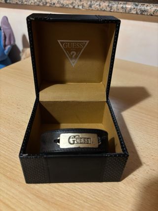 Elegante bracciale Guess con dettagli dorati. - Materiale in pelle nera. - Placca metallica color oro con logo inciso.