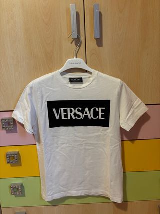Maglietta a maniche corte in cotone bianco con logo Versace. - Veste altre taglie oltre quella indicata - Logo Versace nero stampato sul davanti. - Girocollo.