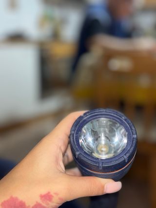 Torcia impermeabile con impugnatura in gomma Rubber. - Colore blu scuro. - Pulsante di accensione arancione. - Laccetto per il trasporto.