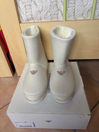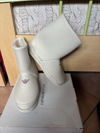 Pantofole Emporio Armani in morbido tessuto bianco, perfette per stare in casa con stile. - Logo Emporio Armani ricamato. - Fodera interna in caldo tessuto. - Suola piatta e confortevole.