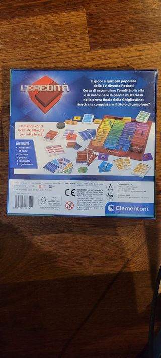 Vendo il gioco da tavolo L'Eredità, edizione pocket. È il gioco ufficiale del quiz televisivo, con domande a 3 livelli di difficoltà. Perfetto per giocare in famiglia o con gli amici! - Include 145 carte. - Adatto a 2-6 giocatori. - Partite della durata di circa 45 minuti. - Gioco in ottime condizioni.