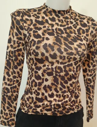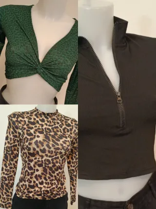 Set composto da tre top da donna. - Top verde con stampa animalier e nodo. - Top nero con zip frontale. - top stampa animalier
