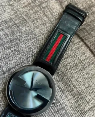 Elegante orologio Gucci con un design distintivo. - Cassa rotonda in metallo. - Quadrante con logo G oversize. - Cinturino in pelle nera con inserto a righe. - Chiusura con fibbia.