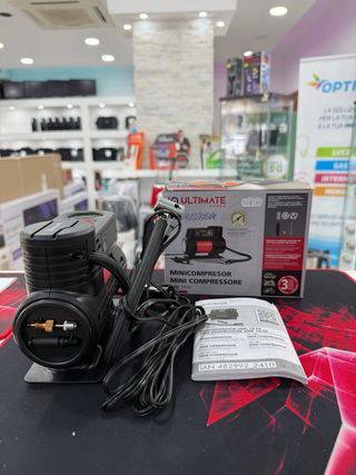 Mini compressore portatile marca Ultimate Speed, ideale per gonfiare pneumatici. - Modello: Minicompressione - Alimentazione: 12V - Pressione massima: 100 PSI - Tubo flessibile e cavo di alimentazione inclusi - Adattatori per vari usi