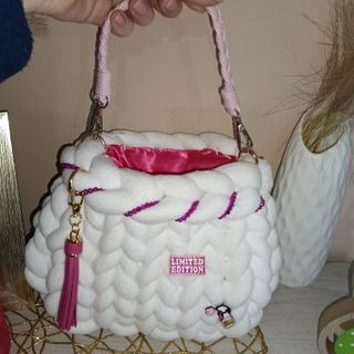 Borsa a mano in filato chunky, con dettagli intrecciati e perline. 500 gr - Manico in corda rosa. - Fodera interna in raso fucsia. - Charm con nappa fucsia. - Patch Limited Edition applicato. - Charm a forma spray con scritta "idiot repellent"