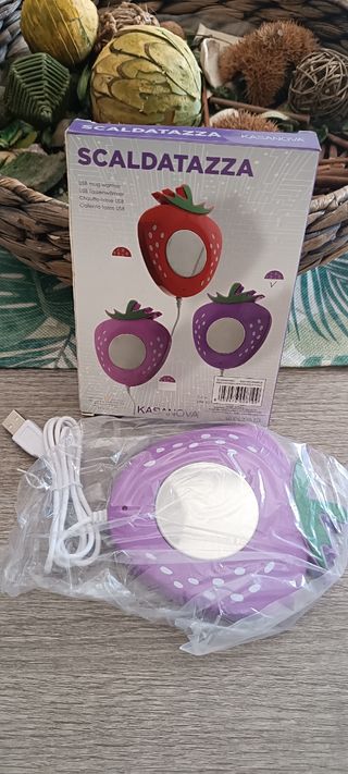 Scalda tazza USB Kasanova, nuovo, mai usato. Perfetto per mantenere le tue bevande calde fino a 45°. - Riscaldamento in alluminio e vetro. - Alimentazione USB. - Potenza 2.5 W. - Colore viola con dettagli a forma di fragola.