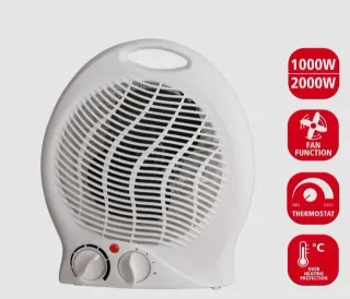 Termoventilatore bianco, compatto e portatile, ideale per riscaldare piccoli ambienti. - Due impostazioni di calore. - Termostato regolabile. - Protezione dal surriscaldamento.