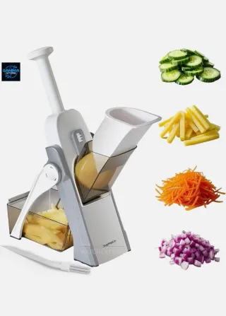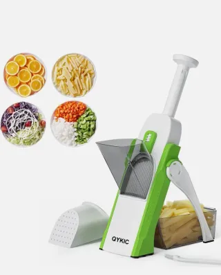 Affettatrice per verdure QYKIC, nuova e mai usata. Ideale per tagliare frutta e verdura in modo rapido e uniforme. - Colore bianco e verde. - Design compatto e funzionale. - Include diversi accessori per differenti tagli.