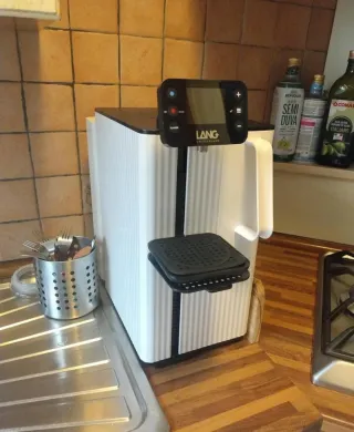 Depuratore Acqua Domestico Portatile con Osmosi Inversa e Mineralizzazione . Senza Installazione al rubinetto.Basta collegare il cavo. Erogatore di Acqua Calda. Minerali Inclusi. Dimensioni del prodotto 35L x 21l x 47H cm Capacità 2,5 litri ,peso 9kg Depuratore d'acqua LANG, nuovo e mai utilizzato. - Design moderno e compatto. - Pannello di controllo touch screen. - Finitura bianca a coste.