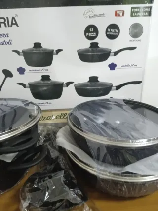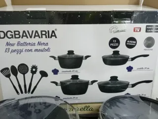 Set di pentole e padelle DGBAVARIA, linea Batteria Nera. - 13 pezzi totali, inclusi mestoli. - Rivestimento interno antiaderente In Pietra. - Adatto per piani cottura a induzione. - Include casseruola da 20 cm e 24 cm. - Include padella da 24 cm e 28 cm.