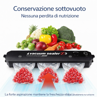 Macchina per il sottovuoto di alimenti, ideale per conservare al meglio cibi e bevande. - Conservazione sottovuoto. - Nessuna perdita di nutrizione. - Forte aspirazione per mantenere la freschezza.