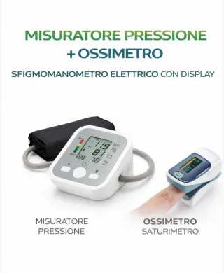 Set composto da misuratore di pressione digitale e saturimetro. - Misuratore di pressione elettrico con display. - Saturimetro da dito.