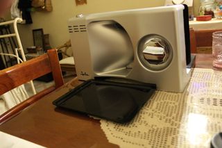Affettatrice elettrica di colore bianco. - Lama seghettata. - Design compatto.