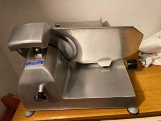 Affettatrice professionale in metallo. - Lama affilata. - Manopola di regolazione spessore. - Base stabile. usata pochissimo,lama da 250 mm, con affila lama integrato, piano scorrevole 235 x 220 mm, motore e cinghia ancora Perfetti, tutta funzionante,nessun segno di ruggine, qualche piccolo segno di utilizzo. Pesa poco più di 15 kg