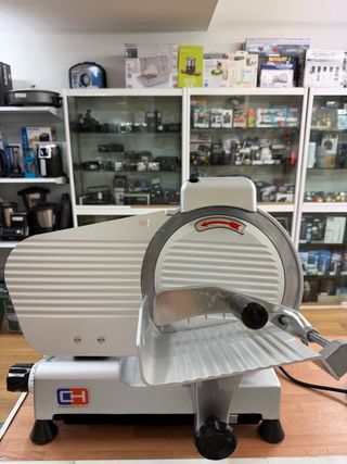 Affettatrice professionale Clima Hosteleria modello MS-250. Ideale per attività di ristorazione. Design robusto e durevole, lama di taglio, base stabile con piedini antiscivolo. Funziona perfettamente ed è in ottime condizioni. Siamo un negozio fisico situato al Paseo de Extremadura N14, Easy Money Store. Offriamo 1 anno di garanzia. Il nostro numero di contatto è 912625675.