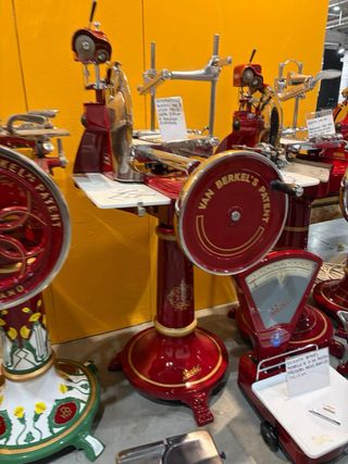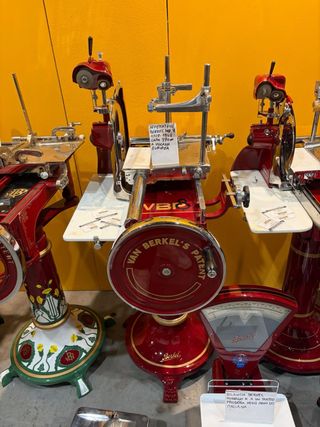 bellissima affettatrice antica a volano -Berkel modello: 9h -Prodotta negli anni: 1936 - 1969 -Misure lama: 319 mm -Colore: rosso -Completamente restaurata, restauro di altissima qualità, la affettatrice viene tutta smontata, i pezzi in ghisa vengono sabbiati poi portati in carrozzeria dove vengono stuccati, verniciati, decorati e applicata una vernice trasparente per proteggere le decorazioni e la vernice, i pezzi in ferro e alluminio vengono lucidati e cromati, se irriparabili addirittura cambiati, come i cuscinetti e la lama, in fine la affettatrice viene tutta rimontata da un esperto professionista. -per info 339 801 3721