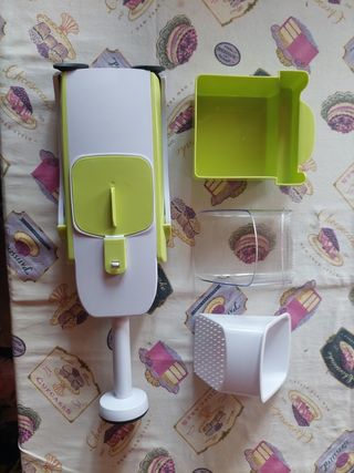 Affettatrice per frutta e verdure con lame intercambiabili in acciaio inossidabile. Il set non è mai stato utilizzato. 4 facili attacchi a clip per affettare segmenti di frutta e verdura Mele e mango con facilità Dado e fette di verdure, comprese le patate Impugnatura morbida per una migliore ergonomia. Semplice da pulire e conservare in modo sicuro. Lavare esclusivamente a mano. Dimensioni: 15,9 x 12,4 x 8,5 cm.