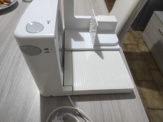 Utilissima affettatrice super compatta e salva spazio (misure A 35cm, L 40cm P 20cm) ideale per salumi, formaggi e pane grazie alla sua lama seghettata e removibile, tasto di sicura per evitare l'avviamento involontario della lama, protezione dita, fermo del prodotto affettato, cavo avvolgibile, potenza 100W, piccolo graffio come da foto sul proteggi dita e gancio di plastica rotto (che non ne pregiudica il funzionamento) per un difetto di fabbrica del gancio del tagliere
