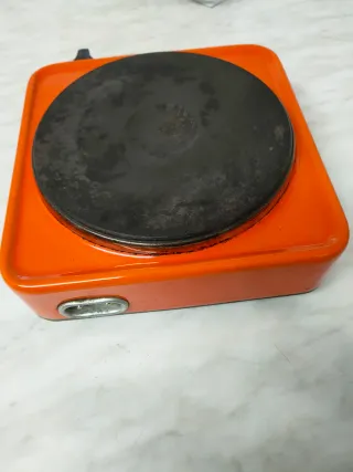 Piastra elettrica portatile di colore arancione lucido. Ideale per cucinare ovunque. Funziona riscaldando la piastra in ghisa tramite resistenza elettrica. - Design compatto e facile da trasportare. - Superficie di cottura rotonda. - Manopola di regolazione della temperatura. - Cavo di alimentazione.