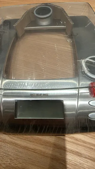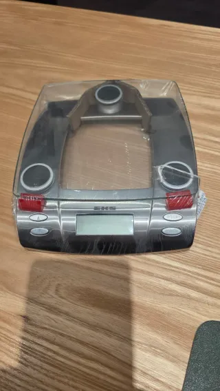 Bilancia digitale con display LCD e pulsanti. - Design moderno in metallo e plastica. - Due pulsanti sul lato destro: 'on/set' e 'mode'. - Due pulsanti sul lato sinistro con frecce. - Indicatore rosso sul lato.