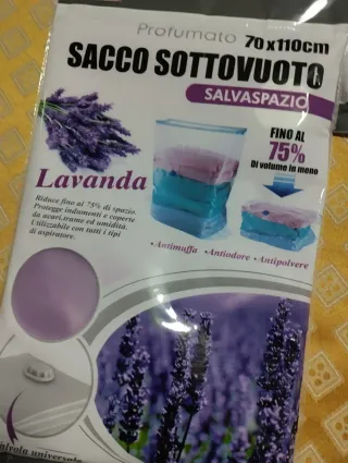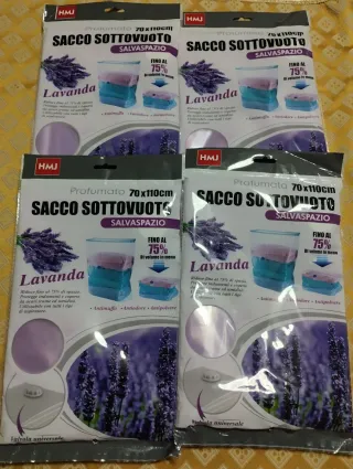 Set di 4 sacchi sottovuoto profumati alla lavanda, ideali per conservare biancheria e coperte. - Misura 70x110 cm. - Riducono il volume fino al 75%. - Proteggono da acari, muffa e umidità. - Valvola universale compatibile con tutti gli aspirapolvere.