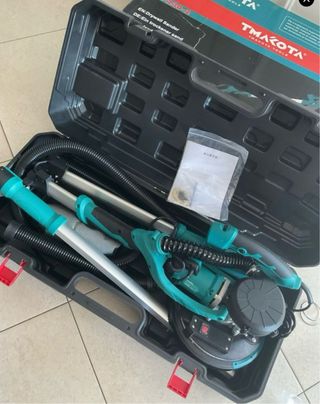 Levigatrice per Muro e Soffitti Levigatrice a Giraffa 800w Con 5 Regolazione di Velocità 800-2300RPM Con LED Raccolta automatica di polvere e 6 Dischi di Carta Abrasiva Questa levigatrice per cartongesso offre una soluzione completa e efficiente per ottenere superfici lisce e pulite con facilità. Dotata di un sistema di aspirazione automatica che assorbe il 99,99% della polvere durante il processo di levigatura, ti permette di mantenere tutto pulito senza la necessità di passare l'aspirapolvere. Grazie al tubo flessibile e al sacco per la polvere, l'ambiente di lavoro rimane ordinato e privo di residui. La sua versatilità è evidenziata dalla presenza di 5 velocità regolabili, che vanno da 800 a 2300RPM, adattabili alle diverse superfici da levigare. La piastra di levigatura, con la sua capacità di rotazione in varie direzioni, garantisce un risultato uniforme e liscio, mentre la molla integrata assicura un angolo costante per levigare anche i soffitti con facilità.