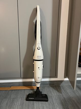 Aspirapolvere Rowenta di colore bianco, dal design moderno e compatto. - Manico ergonomico per una presa confortevole. - Cavo di alimentazione integrato. - Spazzola per pavimenti. - Serbatoio raccogli polvere.