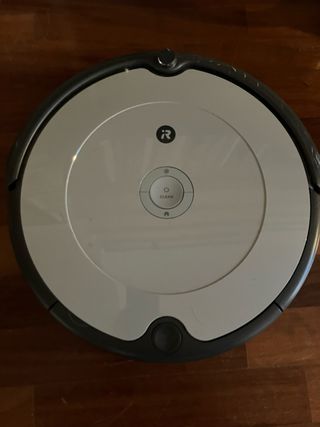 Robot aspirapolvere Roomba, modello Robotino. - Colore grigio e bianco. - Design circolare. Assenza di scatola