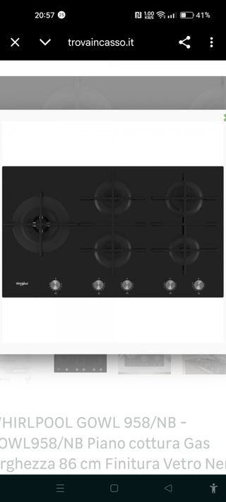 Vendo piano cottura WHIRLPOOL GOWL 958/NB A GAS 5 FUOCHI PRECISE FLAME IXELIUM VETRO ColoreE NERO. Nuovo mai usato ed ancora nel suo imballaggio originale. Vendo per inutilizzo e cambio cucina ed elettrodomestici. Prezzo euro 430. Resistenze 5 Colore Nero Sorgente di alimentazione Materiale superficie riscaldatore Vetroceramica Tipologia di prodotto: COOKTOP 220-240V - 50/60HZ - 2,9!KW Misure: 80*64*64 cm Però lordo 49 kg Peso: 18,6 Kg