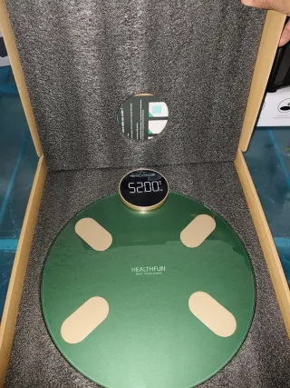 Bilancia digitale in vetro dal design moderno, colore verde. - Superficie in vetro temperato. - Display digitale a LED. - Design rotondo con piedini antiscivolo. Bilancia in vetro ancora nuova, intelligente con misuratore di grasso corporeo. Display digitale, bluetooth, QR code per collegare all'app ufficiale.