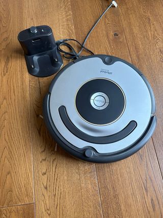Robot aspirapolvere iRobot Roomba, ideale per la pulizia della casa. Si ricarica autonomamente sulla sua base. - Colore grigio e nero. - Base di ricarica inclusa. - Pulsanti Clean, Spot e Dock sul dispositivo.