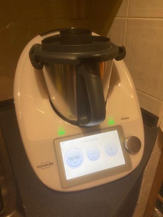 Vendo Bimby TM7 usato pochissime volte, praticamente nuovo. - Colore nero con finiture rigate. - Manico in metallo lucido. - Display touch screen. - Logo Vorwerk ben visibile.