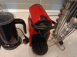 Set composto da macchina per caffè Krups e montalatte. - Macchina per caffè di colore rosso. - Montalatte nero. - Portacialde in metallo.