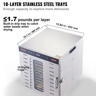 10 Vassoi in Acciaio Inox: questo essiccatore per alimenti includono 10 vassoi in acciaio inossidabile 304 per uso alimentare e di misura singolare da 377 x 285 mm. Ogni strato può contenere fino a 770g di cibo, così si può preparare diversi tipi di cibi contemporaneamente. Tensione 220V / 50Hz Potenza 1000W Materiale acciaio inossidabile Intervallo di temperatura 86-194 ℉ / 30-90 ℃ Intervallo di tempo 0,5-48 ore Dimensioni singolari del vassoio 14,8 x 11,2 pollici / 377 x 285 mm Dimensioni generali 18,1 x 16,5 x 18,3 pollici / 460 x 420 x 465 mm Approvazione FDA