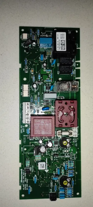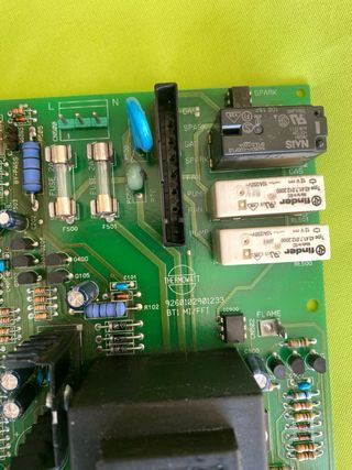 Scheda elettronica per caldaia, componente di ricambio. - Componenti elettronici visibili sulla scheda. - Connettori neri e bianchi. - Trasformatore nero. - Fusibili. - Condensatori. Scheda caldaia monta su aristor, rado,mts,t2 23 mi,e altri modelli perfettamente funzionante