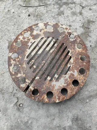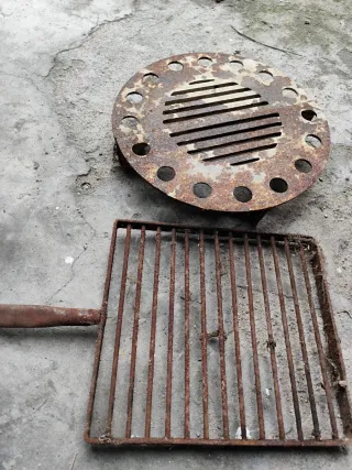 Griglia circolare per caldaia con design a barre e fori sul bordo. Include una griglia rettangolare con manico. Griglia circolare in metallo con ossidazione. Griglia rettangolare in metallo con ossidazione.