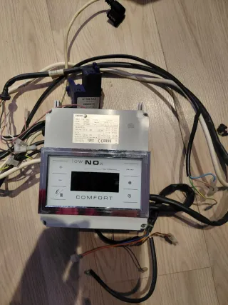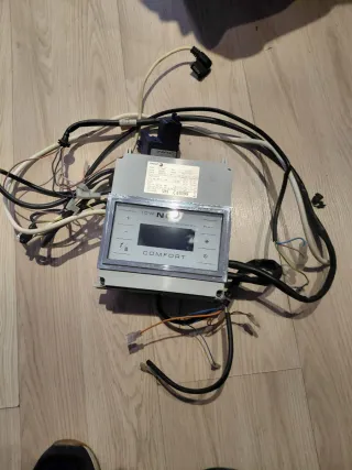 Pannello di controllo COMFORT con schermo touch e relativo cablaggio. - Schermo touch con interfaccia COMFORT. - Include tutti i cavi visibili nell'immagine. - Etichetta con informazioni tecniche visibile. L'unico difetto è il punto di avvitamento che si è incrinato, ma è incollato e non si rompe.