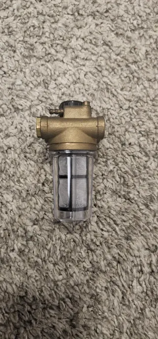 Filtro per caldaia a gasolio con corpo in ottone e contenitore trasparente. - Corpo principale in ottone. - Contenitore in plastica trasparente per visualizzazione. - Maglia interna di filtraggio.