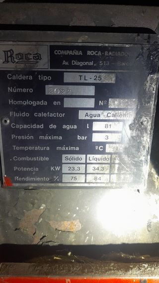 Caldaia mista per legna o gasolio, marca Roca. È necessario smontarla per rimuoverla a causa del suo peso. La parte a legna non è mai stata utilizzata, ha sempre funzionato a gasolio. È stata smessa per l'acquisto di una più efficiente.