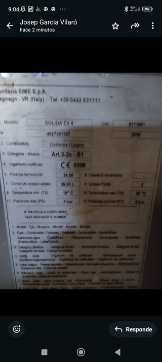 Vendo caldaia a legna, in carbonio con bruciatore diesel extra. 15.500 Kcal. È stato rimosso perfettamente funzionante. Non ha una maniglia per l'apertura della porta (è un perno quadrato), il bruciatore aggiuntivo (che può essere impostato o meno) è del marchio Lamborghini. Non include né effettua il carico, lo scarico, il trasporto o la spedizione. Interessato a ritirarlo. Prezzo fisso NON negoziabile