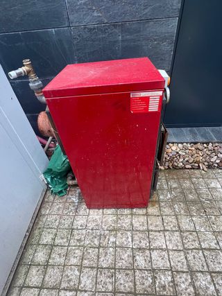 Caldaia del marchio Roca, originariamente a legna e adattata per gasóleo. Un'apparecchiatura robusta e funzionale. Colore principale nero con dettagli in rosso. Progettata per offrire un rendimento efficiente. Capacità approssimativa di 700 litri.