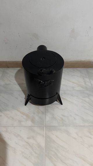 Stufa a legna antica, ideale per riscaldare piccoli spazi. È un pezzo robusto, scuro, con un design classico. Diametro del tubo di uscita 8 cm, diametro interno della caldaia 25 cm e altezza interna 20 cm. 37 cm di altezza, 26 cm di diametro. - Perfetto per uso interno. - Ha un design compatto e facile da trasportare.