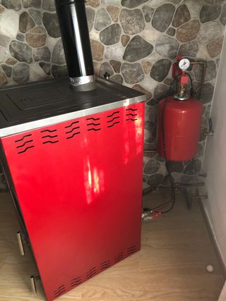 Caldaia a legna in buone condizioni. - Colore principale rosso con dettagli neri.