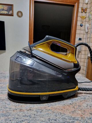 Ferro da stiro con caldaia ad autonomia illimitata fino a 6 bar. Piastra brevettata con innovativa tecnologia 360° Fluid Curve: ottima scorrevolezza, distribuzione omogenea del vapore e forma arrotondata per una stiratura multidirezionale che supera gli ostacoli Facile pulizia della caldaia con sistema Calc Cleaning, serbatoio da 1.3 L, riscaldamento rapido 2 minuti, funzione auto spegnimento e chiusura blocca ferro per facile trasporto. Il ferro è decalcificato, revisionato e garantito