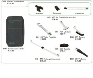 Set di accessori per Vorwerk VK7. - Borsa porta accessori. - Tubo prolunga. - Spazzola. - Accessorio FD7. - Accessorio CD7.