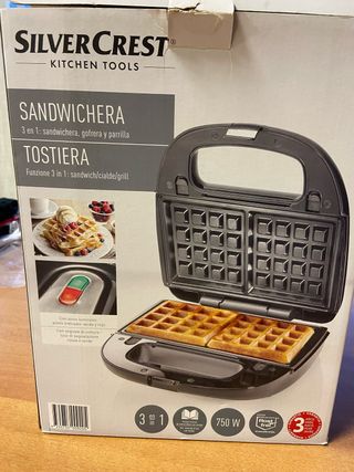 Piastra SilverCrest 3 in 1 per sandwich, waffle e grigliata. - Piastre antiaderenti. - Spia luminosa di funzionamento e temperatura. - Potenza 750 W. Le misure sono quelle della scatola.