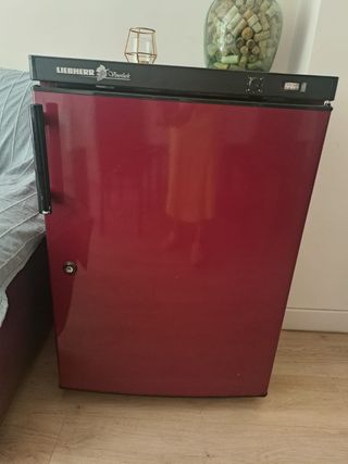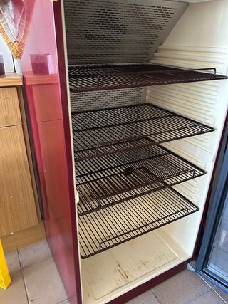 Cantinetta per vino di grande capacità, di colore rosso scuro. È in buone condizioni, anche se presenta alcuni segni di utilizzo. - Ideale per conservare un gran numero di bottiglie - Ripiani in griglia metallica. - Design classico
