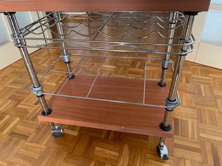 Pratica cantinetta per vini dal design rustico. - Struttura in legno massello. - Quattro livelli per bottiglie - Ruote per una facile mobilità - Un cassetto superiore con maniglia.