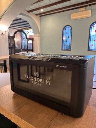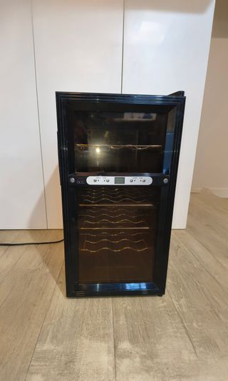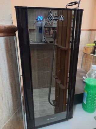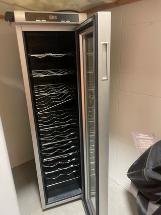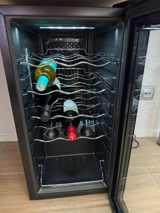 Cantinetta per vino della marca Bodega Pirineos. - Design elegante con porta in vetro. - Pannello di controllo digitale per temperatura e luce. - Ripiani interni per bottiglie.